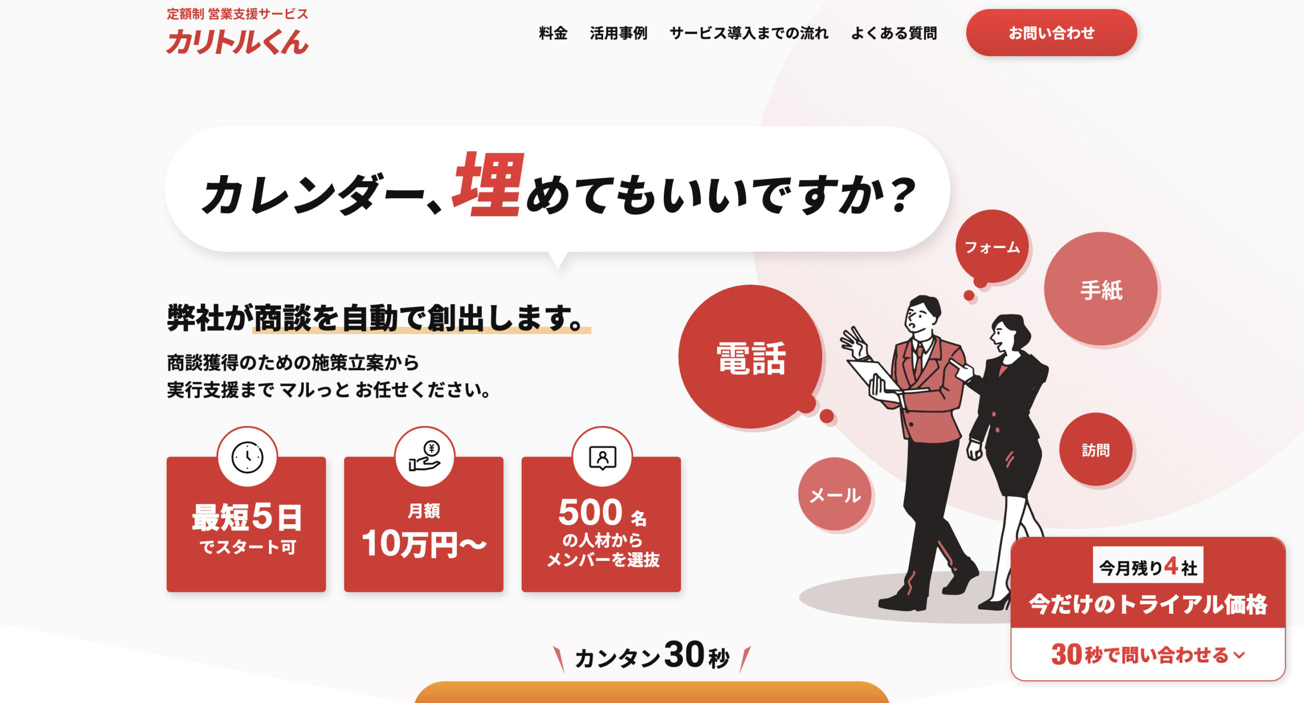 カリトルくんは、月額10万円からあらゆる営業手法が使えるWeb制作向けの定額制営業サービスです。