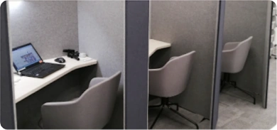 A spacious chair and a meeting room designed with privacy in mind.
